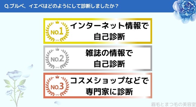 ブルベ、イエベをどのように診断したのかお聞きしたところ「1位>インターネット情報で自己診断」、「2位>雑誌の情報で自己診断」、「3位>コスメショップなどで専門家に診断」という結果になりました。