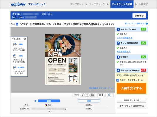 株式会社グラフィックネットプリント(本社:京都市伏見区、代表取締役社長:西野能央、以下「当社」)が運営する、ネット印刷事業「印刷の通販(R) グラフィック」にて、入稿データを自動でチェックし、仕上がりイメージを確認できる「スマートチェック」に新機能を追加。入稿データのプレビュー画面を、商品出荷後でも閲覧いただけるようになりました。