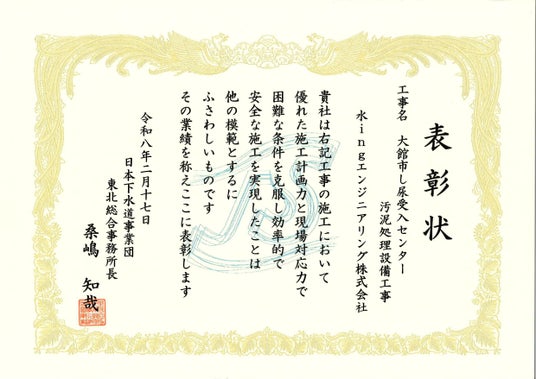 水ing株式会社のグループ会社である水ingエンジニアリング株式会社(社長:須山 晃延、住所:東京都港区)は2月17日、日本下水道事業団(以下JS)東北総合事務所より、令和7年度「優良工事」ならびに「優良工事技術者」として選定、表彰されたことをお知らせします。