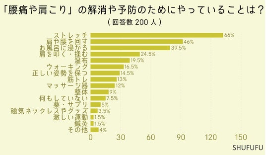 「腰痛や肩こり」の解消や予防のためにやっていることを尋ねたところ、1位は「ストレッチ(66%)」、2位「肩や腰を回す(46%)」となりました。体をほぐすことで血行がよくなり、筋肉のこわばりが緩和されるそうですね。お家で簡単にできて手軽な方法なので、実行している方が多いようです。