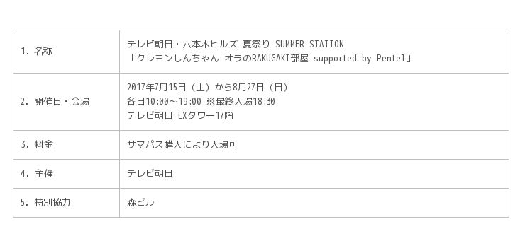 ぺんてる株式会社(本社:東京都中央区日本橋小網町7-2 、代表: 和田 優)は、7月15日(土)から8月27日(日)まで開催されるテレビ朝日・六本木ヒルズ 夏祭り SUMMER STATION内のイベント『クレヨンしんちゃん オラのRAKUGAKI部屋』を、サポート致します。