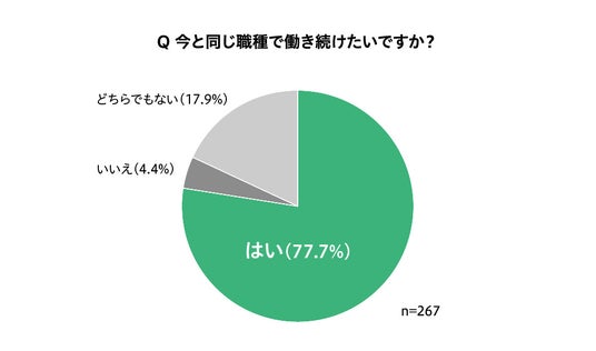 就労意欲について聞いたところ、今後も働き続けることに「はい」が85.8%、「いいえ」が3.0%、「どちらでもない」が11.2%と、9割弱が働き続ける意欲を持っていることがわかりました。何歳まで働きたいかについては、「71歳~75歳」が52.8%、「76歳~80歳」が21.4%、「81歳~100歳」が1.3%、「生涯現役」が6.1%と、約8割が71歳以降も働き続けたいと回答しています。また、今後も働き続けたいと回答した人のうち、今と同じ職種で働き続けたいかについて、「はい」が77.7%、「いいえ」が4.4%、「どちらでもない」が17.9%となり、約8割が今後も介護職として勤務する意欲があることが伺えます。