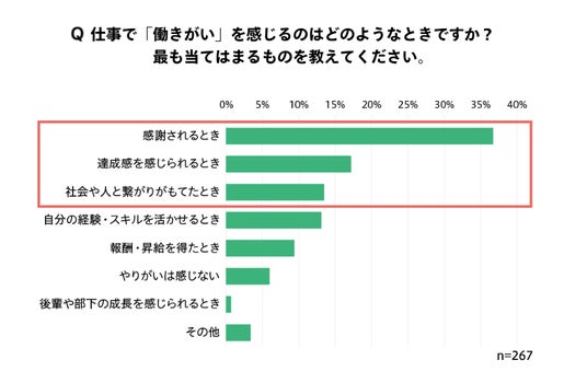 仕事をする理由として、「生計維持」が30.3%、「自由に使える収入を得る」が15.0%と、およそ半数が収入を目的とする一方、「生きがい・やりがい」が22.5%、「社会貢献」が11.2%、「健康維持」が10.5%、「人との繋がりをつくる」が10.1%と、半数以上が内発的動機によることが伺えました。さらに、「働きがい」を感じるときについては「感謝されるとき」が最も高く36.7%、次いで「達成感を感じられるとき」が17.2%、「社会や人と繋がりが持てたとき」が13.5%と続きました。仕事を通じた自己成長や周囲の人との繋がりを「働きがい」と感じている人が多いことがわかります。