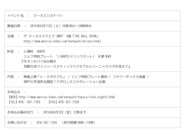 感動シーンのプロデュースを手がける感動創出企業、株式会社ポジティブドリームパーソンズ(本社:東京都渋谷区 代表取締役社長:杉元崇将、以下PDP)は、運営するパーティ会場「ザ マーカススクエア 神戸(ホテルクラウンパレス神戸内)」にて、映画「レ・ミゼラブル」と食事のセットを2,000円で楽しめるイベント「マーカスシネナイト」を2016年6月11日(土)に開催いたします。