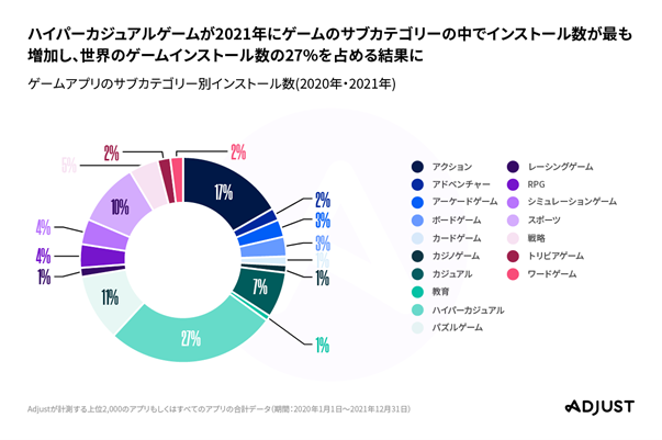 ● ハイパーカジュアルゲームはその存在感を維持し、全ゲームアプリインストール数の最大シェア(27%)を