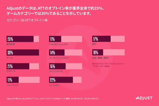 2021年4月にAppleのiOS 14.5およびAppTrackingTransparency(ATT)frameworkがリリースされたことを受け、モバイルマーケティング業界は、ユーザープライバシーと計測に対するアプローチの見直しを余儀なくされました。当初の予測では、業界全体のオプトイン率はわずか5%ほどとされていたにもかかわらず、Adjustのデータによると、2021年12月末時点での全アプリカテゴリーのオプトイン率は約25%(2021年5月の16%から上昇)、ゲームアプリにおけるオプトイン率は30%と全カテゴリーの中で最も高く、約3人に一人が許可をしていることが分かりました。