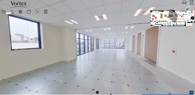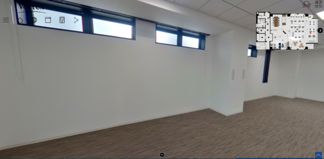 「バーチャルモデルルーム」とは、空室物件の写真をもとに、受付や会議室、デスク、キャビネットなどをバーチャル上で配置し、リアルな内装付きオフィスの空間を表現したもので、360度パノラマで室内を見渡すこともできます。画面上でのフロアの移動もスムーズで、オフィスの全貌を現実に近い状態で確認できます。