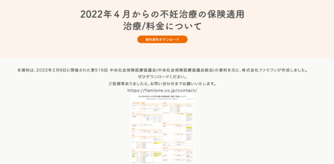診療報酬改定に関する総会資料は公開されておりますが、多くの妊活・不妊治療に取り組む方からは「実際の自己負担額はどうなるのか知りたい」「どの治療が対象となったのか教えてほしい」といった声が当社に数多く届いており、2022年4月からの不妊治療の保険適用 治療/料金について、2022年2月9日時点での診療報酬の点数と自己負担(3割)の費用の一覧表を作成し、無料で公開をすることを決定しました。( ダウンロードページ https://famione.co.jp/insurance-coverage/)。あくまでも現時点の情報であり、それぞれ条件があるものがありますが、今後の治療の参考になればと考えております。