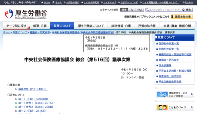 2022年2月9日開催 第516回 中央社会保険医療協議会
