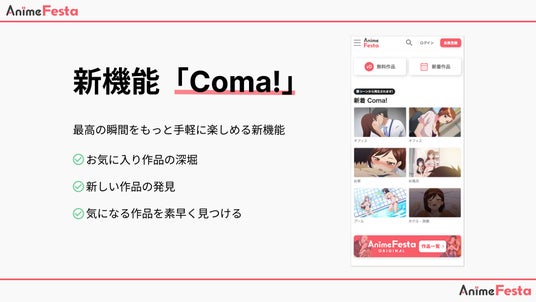 株式会社ウェイブ(本社:東京都豊島区、代表:関口航太)が運営するアニメ見放題サービス「AnimeFesta(アニメフェスタ)」は、本日6月18日(火)に、新機能「Coma!」をリリースいたしました。この新機能は、ユーザーがアニメの特定シーンを楽しむことができる機能です。