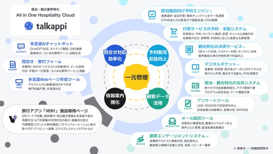 宿泊・観光業界に特化したAll in One Hospitality Cloud「talkappi(トーカッピ)」は、宿泊施設や観光事業者向けに、問い合わせ対応・情報案内・会員管理・予約・決済など、ゲスト応対と施設運営に必要な機能をオールインワンで提供するクラウドサービスです。 現在、日本国内の代表的なホテル・旅館をはじめ、1,800以上の宿泊施設および北海道・沖縄県・奈良市・草津温泉などの自治体・観光協会・DMOに導入され、全国各地で観光・宿泊DXを支えております。