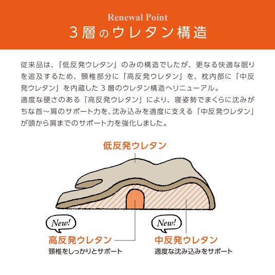 従来品は、「低反発ウレタン」のみの構造でしたが、更なる快適な眠りを追及するため、頚椎部分に「高反発ウレタン」を、枕内部に「中反発ウレタン」を内蔵した3層のウレタン構造へリニューアル。