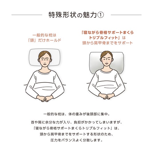 一般的な枕は、体の重みが後頭部に集中。首や肩に余分な力が入り、負担がかかってしまいますが、「寝ながら骨格サポートまくらトリプルフィット」は、頭から肩甲骨までをサポートする形状のため、圧力をバランスよく分散します。