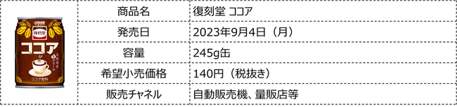 ダイドードリンコ株式会社(本社:大阪市北区、代表取締役社長:中島 孝徳)は、2023年秋冬の新商品として、「復刻堂 ココア」を9月4日(月)より発売いたします。
