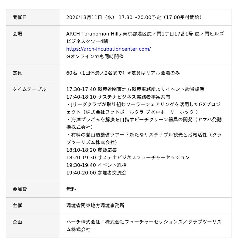 “Publishing a Better Future”をコンセプトに、サステナビリティ領域における専門性・グローバルネットワーク・デジタルメディア運営に強みを持つハーチ株式会社(代表取締役:加藤 佑、本社:東京都港区、以下ハーチ)は、環境省関東地方環境事務所および共同企画者と共に、サステナビリティ領域におけるビジネス創出の可能性を探究する新たな官民ビジネスコミュニティ「KANTO Sustainable Business Network」を立ち上げます。初回のキックオフとなるミートアップイベントを、2026年3月11日(水)に虎ノ門ヒルズビジネスタワー内「ARCH Toranomon Hills」で開催します。