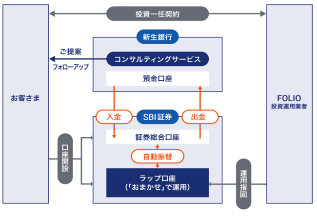 株式会社SBI証券(本社:東京都港区、代表取締役社長:高村正人、以下「SBI証券」)、株式会社新生銀行(本社:東京都中央区、代表取締役社長:川島克哉、以下「新生銀行」)および株式会社FOLIO(本社:東京都千代田区、代表取締役CEO:甲斐真一郎、以下「FOLIO」)は、2022年10月20日(木)から、投資一任サービス「SBIラップ×新生銀行」(店頭限定)の提供を開始しましたので、お知らせします。