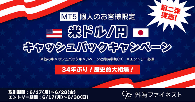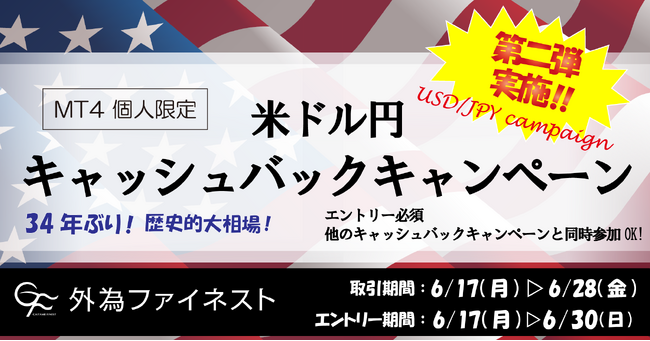 国内FX会社の外為ファイネスト株式会社(本社:東京都千代田区、代表取締役:石野由美子)は、米ドル/円キャッシュバックキャンペーン第二弾を6月17日よりスタートいたしました。