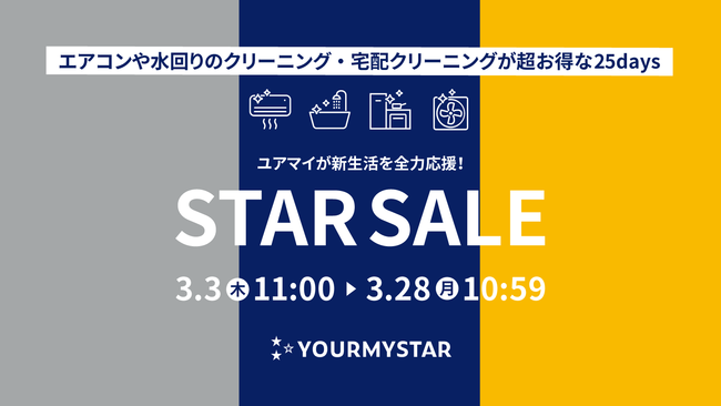 ハウスクリーニング・法人向け清掃や修理・お手入れ等のサービス産業をIT化する日本最大級のプラットフォーム「ユアマイスター」を運営するユアマイスター株式会社(本社:東京都世田谷区、代表取締役社長:星野貴之)は、2022年3月3日(木)から3月28日(月)まで、エアコンクリーニングや水回りクリーニング、宅配クリーニングを大変お得にご利用いただける大型セール「スターセール」(https://yourmystar.jp/star-sale/)を開催します。