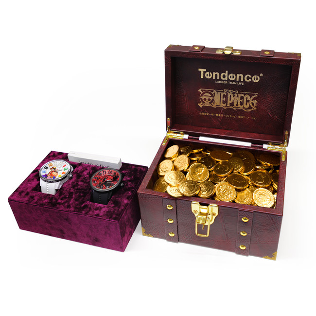 『ルフィモデル』と『シャンクスモデル(レッドver.)』の2種類がセットとなり、オリジナルの宝箱に入った『宝箱セット』。外装はビンテージ感あるボルドーカラーに、ゴールドのスタッズや金具が高級感あふれるデザインの宝箱です。中の時計入れは取り出して単体で飾ることも出来る仕様になっているので、外装は実際に“宝箱”としても使用可能。錠や鍵も付属しています。