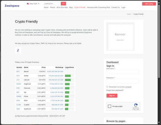 クリプトで東京の部屋を借りれるというページ。 当時はビットコインや、ライトコインや、ドッジコイン等、まだイーサリウムもトップ10に入っていない。ZWNは2015年に同時に開始して、当時の最初のZWNのロゴが表示されている。