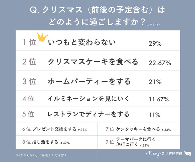 Z世代の男女300名を対象に、冬のイベントに関するアンケートを実施した結果、クリスマスの過ごし方は「いつもと変わらない」が1位(29%)、続いて「クリスマスケーキを食べる」が2位(22.67%)という結果になりました。