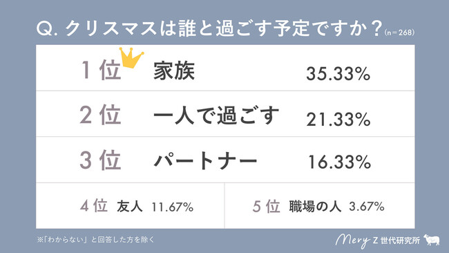 クリスマスを誰と過ごすかのアンケートでは、約3割が「家族」(35.33%)と回答。