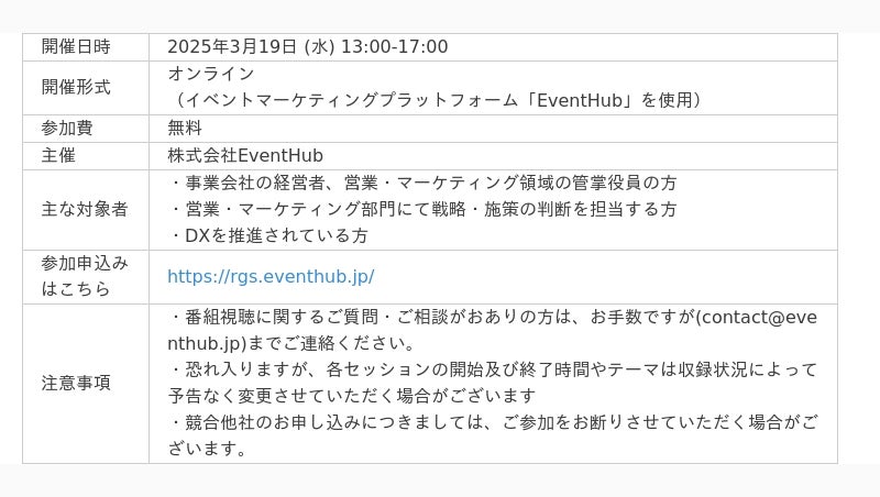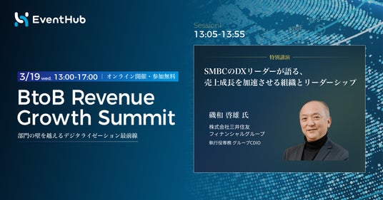 シェアNo.1(※)のイベント・ウェビナーマーケティングプラットフォーム「EventHub」を提供する株式会社EventHub(東京都港区、代表取締役CEO:山本理恵)は、営業・マーケティング組織のDXを深掘りするオンラインカンファレンス『BtoB Revenue Growth Summit ~部門の壁を越えるデジタライゼーション最前線~』を2025年3月19日(水)に開催します。このたび、SMBCグループCDIOの磯和啓雄氏による基調講演が決定いたしましたので、お知らせいたします。