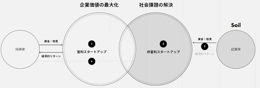 Soilは、非営利スタートアップに圧倒的に不足している創業期の資金を助成し、また成長のための支援をする財団です。「儲からない」けど、「意義がある」 事業に取り組むチームを、あえて現時点では一般的でない「非営利スタートアップ」という言葉で定義しています。