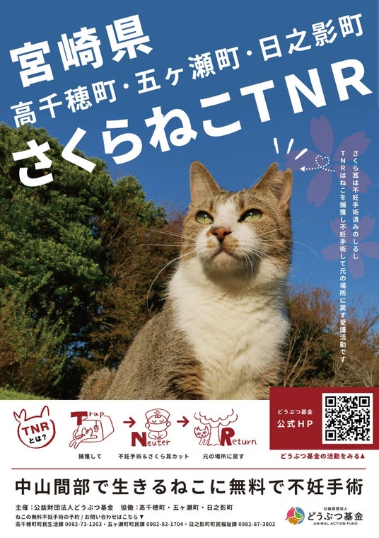犬や猫の殺処分ゼロの実現を目指す公益財団法人どうぶつ基金(所在地:兵庫県芦屋市、理事長:佐上邦久)は、宮崎県の高千穂町(町長:甲斐宗之氏)、五ヶ瀬町(町長:小迫幸弘氏)、日之影町(町長:佐藤貢氏)の3町と協働し、2025年4月~2025年7月の4か月にわたり、3町の中山間地域で生きる猫に無料で不妊手術を行うTNR(※)地域集中プロジェクトを実施します。