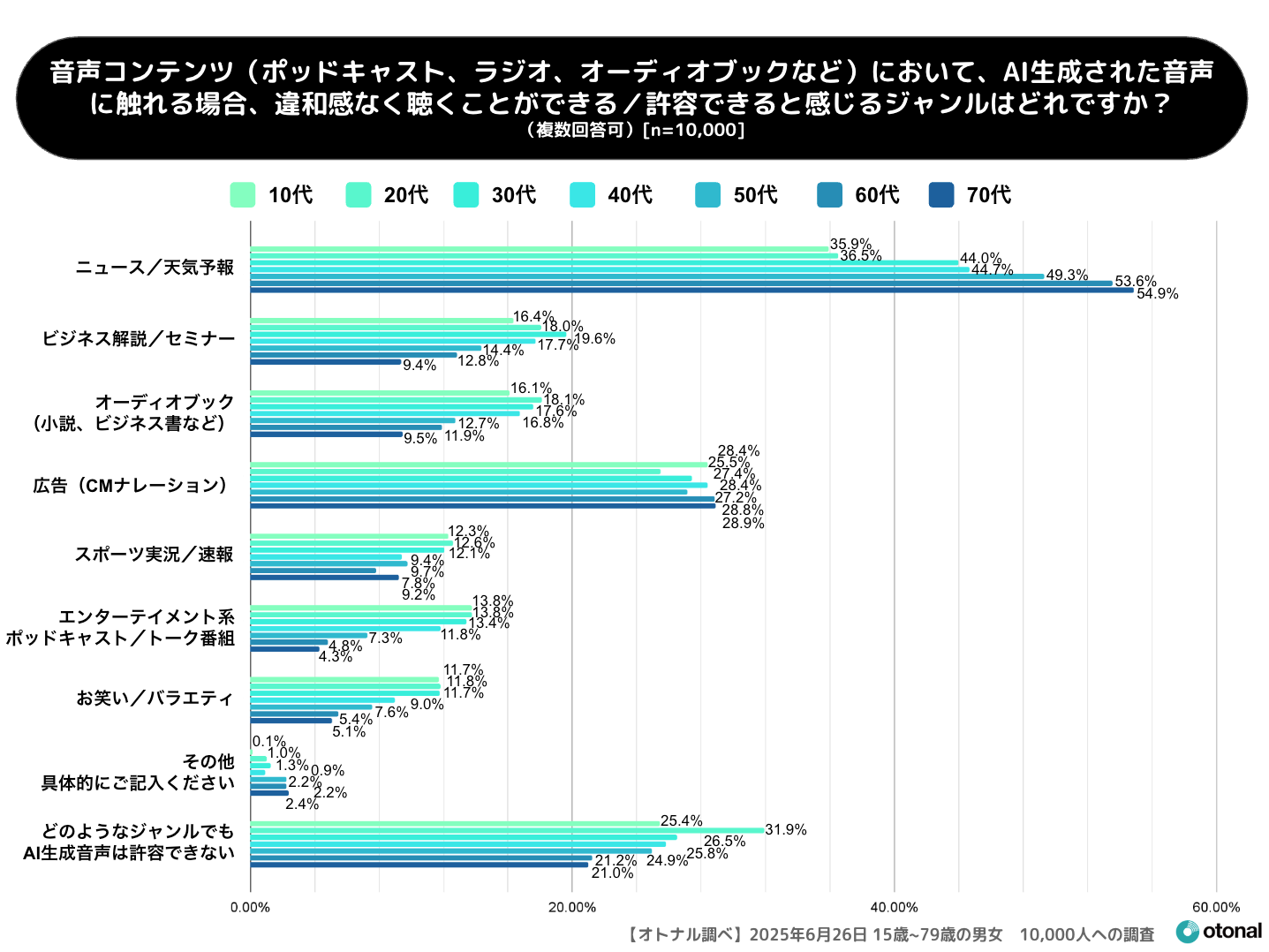 ~全年代が違和感なく聴けるAI生成音声コンテンツはニュース・天気予報が46.9%でトップ。年代間で許容できるジャンルの違いが明らかに~