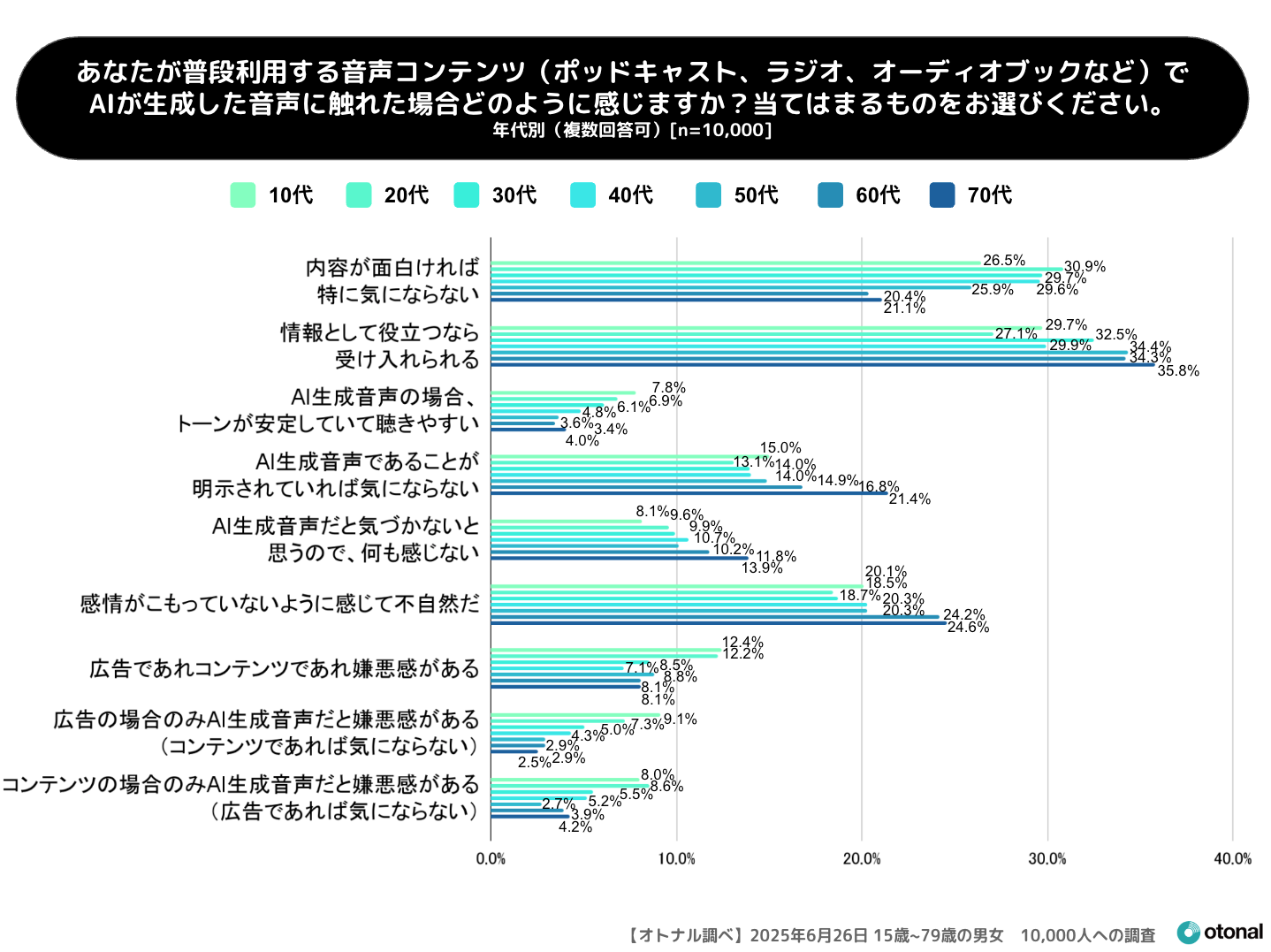 本調査は、10代から70代までの幅広い年代の男女10,000人を対象として2025年6月26日に実施したものです。本調査より、生成AIによる音声コンテンツが、全年代を通じて徐々に受け入れられつつあることが明らかになりました。AI生成音声に触れた際の具体的なイメージや、許容できると感じるコンテンツのジャンルなども年代別に分析しています。