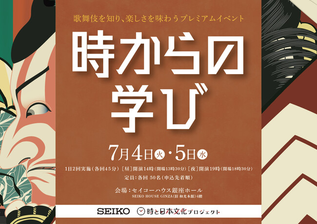 セイコーグループ株式会社(代表取締役会長 兼 グループCEO 兼 グループCCO 服部真二、本社:東京都中央区、以下「セイコー」)は、日本文化の魅力を発信し、多くの人に体感していただく「時と日本文化プロジェクト」の第二弾として、セイコーのグループアンバサダーである歌舞伎俳優 市川團十郎さんをプロデューサーに迎え、第一線で活躍中の歌舞伎俳優や歌舞伎囃子方、歌舞伎脚本家が実演を交えながら歌舞伎の魅力を解説するプレミアムな歌舞伎イベント「時からの学び」を、7月4日・5日の2日間、セイコーハウス銀座ホールにて開催いたします。