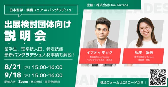 外国人材の紹介・育成を行う株式会社One Terrace(本社:東京都港区、代表取締役:石中達也)は、本年12月にバングラデシュ・ダッカ現地で開催予定の「日本留学・就職フェア in バングラデシュ」に向けて、出展をご検討中の企業様向けオンライン説明会を開催いたします。