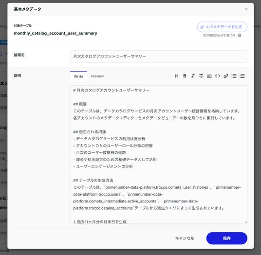 今回リリースする「COMETA AI」のメタデータ生成機能では、メタデータ編集画面においてボタンをクリックするだけでテーブル・カラムの論理名や説明を自動生成します。生成結果はフォームに自動入力され、ユーザーはその内容を自由に修正・保存できます。この機能により、メタデータが少ない段階であっても素早く初期情報を整えることが可能です。