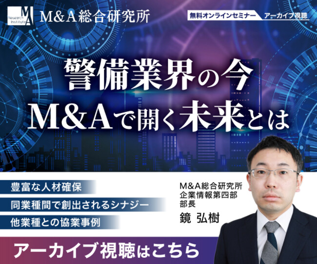 株式会社M&A総合研究所(本社:東京都千代田区、代表取締役社長:佐上 峻作)は、警備業界の経営者様向けに事業継承のセミナーを実施し、アーカイブ視聴が可能になりましたのでお知らせいたします。