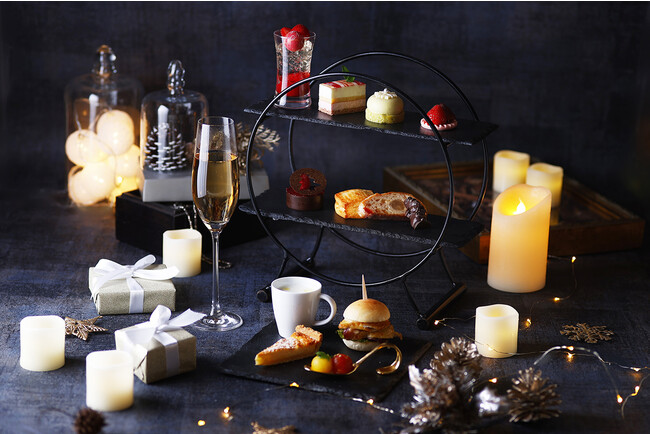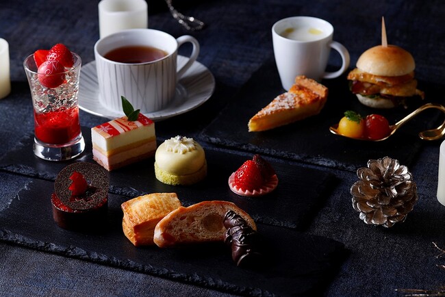 苺とホワイトチョコレートの滑らかなムースを2層にし、優しい甘さの中にバラの香りを忍ばせた「ロゼ・フレーズ」や、甘酸っぱいガナッシュにラズベリーのコンフィチュールを重ね、オーナメントのようなチョコレート細工を添えた「タルトショコラ・マンジャリ」、クリスマスの定番「シュトーレン」など 8 種のスイーツと、小さいながらもジューシーで本格的なローストチキンをピクルスや葉野菜とサンドした「ローストチキンミニバーガー」、チェダー、モッツアレラ、パルメザンなど数種のチーズと生クリームでリッチな味わいに仕上げた「チーズのキッシュ」など4種のセイボリーがクリスマスの特別な高揚感を演出します。また、お飲物は10種類以上ご用意し、中でも期間限定のホテルオリジナルティー「クリスマスアールグレイ」は、国産のみかんや、コーンフラワー、マリーゴールドなどをブレンドし、爽やかな柑橘の中に可憐なフラワーハーブが香ります。