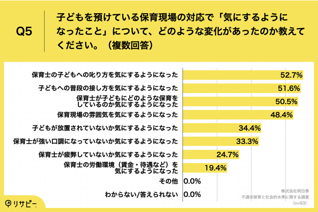 Q4で「非常に気にする(注目する)ようになった」「やや気にする(注目する)ようになった」と回答した方に、「Q5.子どもを預けている保育現場の対応で「気にするようになったこと」について、どのような変化があったのか教えてください。(複数回答)」(n=93)と質問したところ、「保育士の子どもへの叱り方を気にするようになった」が52.7%、「子どもへの普段の接し方を気にするようになった」が51.6%、「保育士が子どもにどのような保育をしているのか気にするようになった」が50.5%という回答となりました。