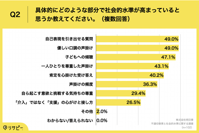 Q1で「非常にそう思う」「ややそう思う」と回答した方に、「Q2.具体的にどのような部分で社会的水準が高まっていると思うか教えてください。(複数回答)」(n=102)と質問したところ、「自己表現を引き出せる質問」が49.0%、「優しい口調の声掛け」が49.0%、「子どもへの傾聴」が47.1%という回答となりました。