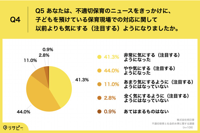 「Q4.あなたは、不適切保育のニュースをきっかけに、子どもを預けている保育現場での対応に関して以前よりも気にする(注目する)ようになりましたか。」(n=109)と質問したところ、「非常に気にする(注目する)ようになった」が41.3%、「やや気にする(注目する)ようになった」が44.0%という回答となりました。
