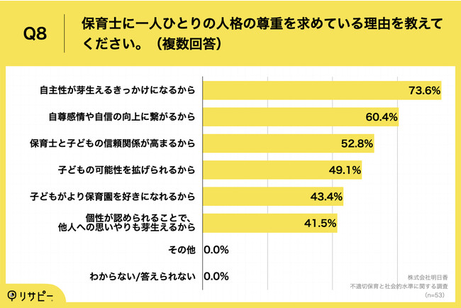 Q6で「子ども一人ひとりの人格の尊重」と回答した方に、「Q8.保育士に一人ひとりの人格の尊重を求めている理由を教えてください。(複数回答)」(n=53)と質問したところ、「自主性が芽生えるきっかけになるから」が73.6%、「自尊感情や自信の向上に繋がるから」が60.4%、「保育士と子どもの信頼関係が高まるから」が52.8%という回答となりました。