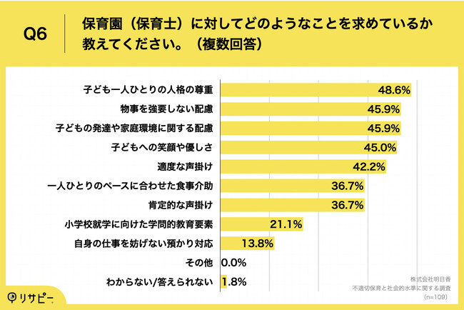 「Q6.保育園(保育士)に対してどのようなことを求めているか教えてください。(複数回答)」(n=109)と質問したところ、「子ども一人ひとりの人格の尊重」が48.6%、「物事を強要しない配慮」が45.9%、「子どもの発達や家庭環境に関する配慮」が45.9%という回答となりました。