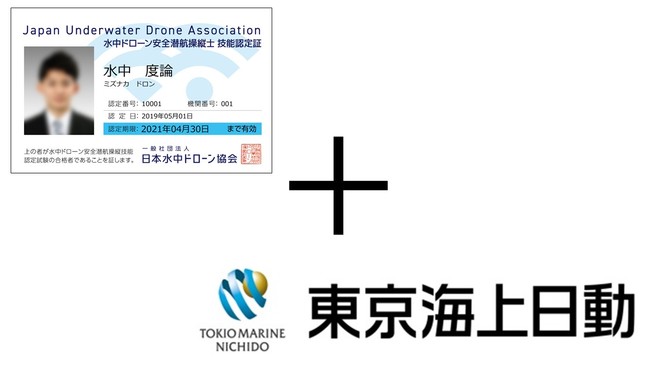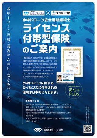 日本水中ドローン協会認定ライセンス「水中ドローン安全潜航操縦士」付帯保険は保険業界大手の「東京海上日動」の保険商品となります。