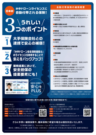 当協会が掲げる「安全」な水中ドローン操縦者の育成輩出、クライアントへの安心も提供できる水中ドローン市場の成長のためにも策定した保険付帯制度になります。
