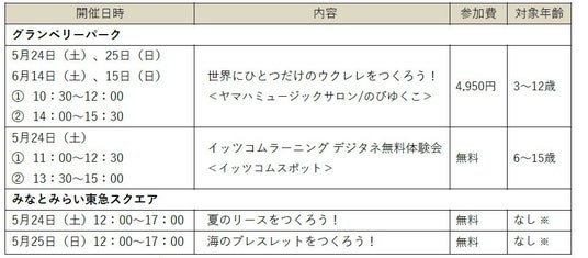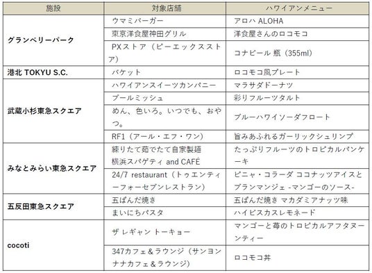 また、東急線沿線6施設では、ハワイをテーマとした「トロピカルフェス」を同時開催。期間中、港北 TOKYU S.C.<バケット>の「ロコモコ風プレート」や、五反田東急スクエア<毎日パスタ>の「ハイビスカスレモネード」など、ハワイアンメニューを堪能できます。グランベリーパーク<ヤマハミュージックサロン/のびゆくこ>では、ウクレレキットに自由に絵を描きオリジナルのウクレレを作るワークショップを、<イッツコムスポット>では、小中学生向けオンラインプログラミング教材「イッツコムラーニング デジタネ」の無料体験会などを実施。みなとみらい東急スクエアでは、夏のリースや海のブレスレットを作ることができるワークショップを開催します。