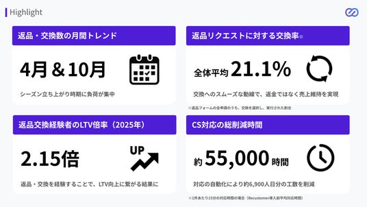 Recustomer株式会社(本社:東京都中央区、代表者:代表取締役 柴田 康弘、辻野 翔大、以下:Recustomer)は、2025年におけるECの返品・交換に関する年間データを分析した「2025年 EC返品・交換データレポート」を発表しました。