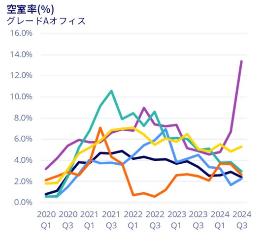供給面では、7~9月期までに2024年に予定されていたすべてのグレードAオフィスが竣工を迎えました。ただし、本体建設工事が完了して竣工した物件の一部では、オフィスとしての運用を開始するオープン日を、竣工から数ヶ月から1年以上先に設定しているケースもあり、実際にオフィスとして稼働するまでのあいだにタイムラグがある物件もあります。
