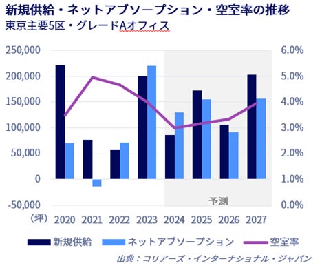 大手総合不動産コンサルティングサービス・投資運用会社であるコリアーズ・インターナショナル・ジャパン株式会社(代表:小笠原 行洋、本社:東京都千代田区、NASDAQおよびTSX:CIGI、以下コリアーズ・ジャパン)は、本日、「東京オフィスマーケットレポート|2024年第3四半期(7‐9月期)東京主要5区・グレードAオフィス 」を発表しました。当レポートは、コリアーズ・ジャパンが、東京主要5区(千代田区・中央区・港区・新宿区・渋谷区)のグレートAオフィスビル※1の賃貸オフィス市況と今後の見通しについて、独自に収集したデータに基づいて分析したものです。