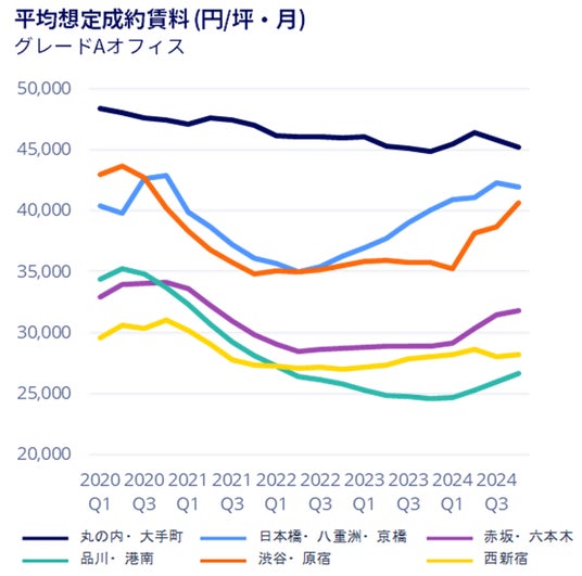 エリア動向:日本橋・八重洲・京橋エリアの賃料上昇が加速し、渋谷・原宿エリアが追随