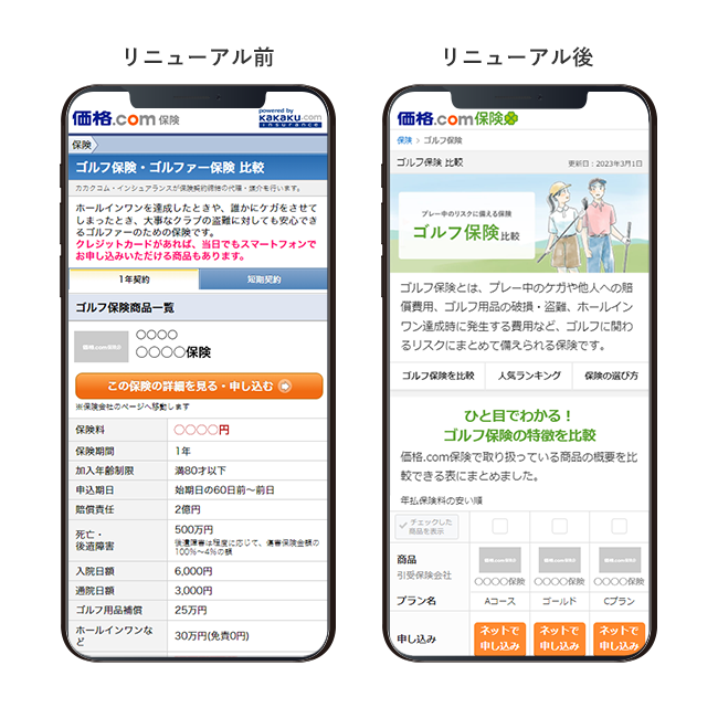 カカクコムグループの株式会社カカクコム・インシュアランス(本社:東京都港区 代表取締役社長:結城晋吾)は、運営する総合保険比較サイト「価格.com保険(https://hoken.kakaku.com/)」(※1)においてゴルフ保険のトップページを全面リニューアルしました。ファイナンシャルプランナー監修コンテンツを追加し、また、商品を選ぶ際に重視したいポイントをわかりやすく表示するデザインに刷新したことで、お客さまの保険選びがよりスムーズになりました。