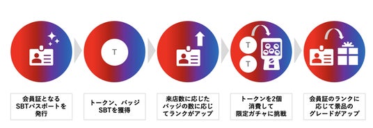 2. 次回来店時に店舗で飲食サービスをご利用いただいた際、バッジSBTを店舗の従業員に提示することにより、店舗ごとに異なる特典が利用できます。